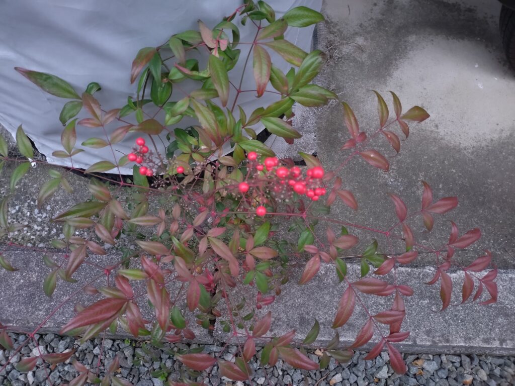 何年か前に、駐車場のコンクリートのスキマから南天のようなものが生えてきたな…と思っていたら、今年はとうとう実がなりました(゚∀゚)